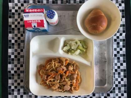 チキントマトスパゲッティ、グリーンアスパラガスとキャベツのサラダ、発酵乳、パン、牛乳