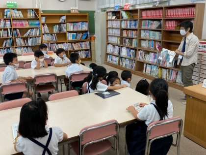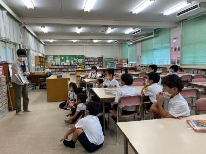 国語科の読書の時間です。図書館で、図書館補助員の方に、絵本の「よみきかせ」をしてもらいました。子どもたちは、興味深く静かにお話を聞いていました。