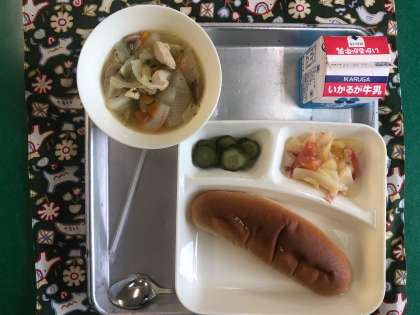 鶏肉とてぼ豆のスープ煮、じゃがいもとトマトのチーズ焼き、きゅうりのサラダ、パン、牛乳