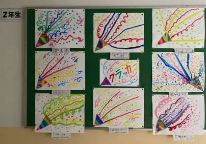 クレパスと絵の具で華やかに描かれています。この作品で初めて絵の具を使いました。線を引いたり描き方の工夫をしました。いきおいよくクラッカーがはじけています。