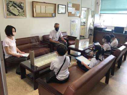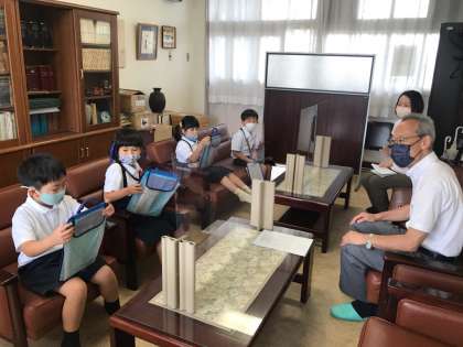 ソファに座らせてもらいました。一人ずつ質問しています。「校長室にはどんなものがありますか」「校長室はどんなことをするところですか」…………聞いてわかったことをワークシートに書きました。質問が終わったあと、タブレットで写真を撮りました。