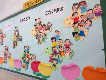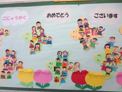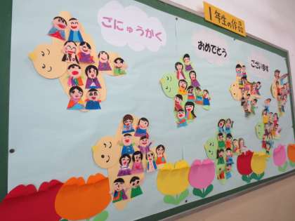 2年生に進級したお友だちが、一つ下の新1年生のみなさんに笑顔のメッセージを掲示しています。みんなニコニコ笑顔で歓迎しています。