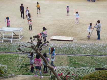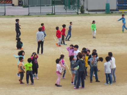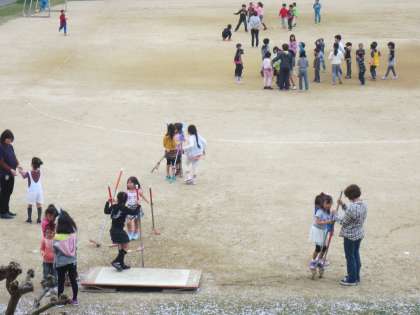 「いきいき活動」の子どもたちは、春の暖かい風をうけながら、元気に運動場で遊んでいます。