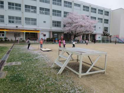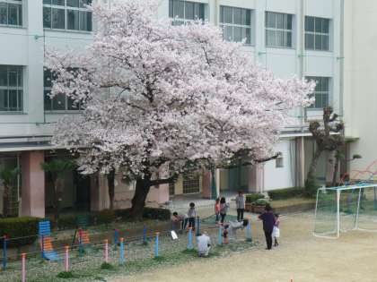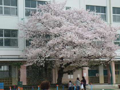 暖かい風が校庭を吹き抜けています。満開に咲いた桜の花びらが舞い落ちています。