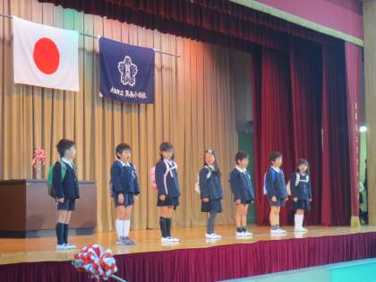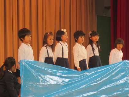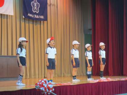 元気で可愛い60名の1年生が入学しました。巽南連合振興町会会長の松下様をはじめ多くの地域の方々がお祝いに来ていただきました。そして、歓迎の演技を2年生が一生懸命にしくれました。