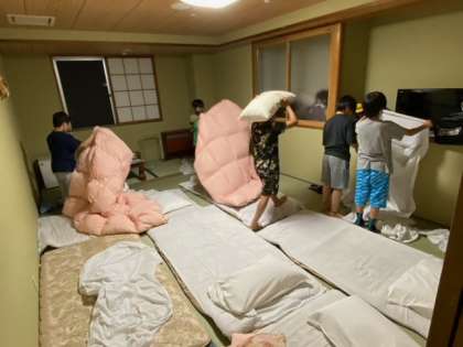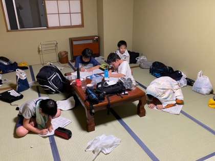 お風呂の順番を待ってる間も大忙し…。旅日記を書いたり、荷物整理をしたり、布団を敷いたりします。みんなで協力できてますね!!