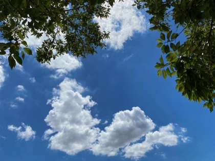 青い空に白い雲、緑の木々、夏の風景です。 今日の大阪の最高気温の予想は36度、猛暑日です。