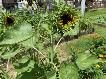 「ヒマワリ」も開花しました。大きな大輪の花を咲かせてくれるでしょう。