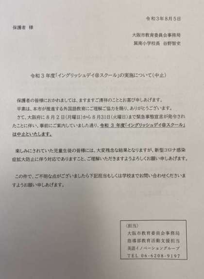 昨日、大阪市教育委員会より連絡があり、8月18日に実施予定の、子どもたちの英語体験イベントである「イングリッシュデイ@スクール」が緊急事態宣言の発令で中止になりました。