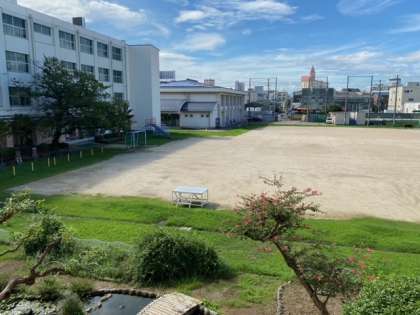久々に、午前中から晴れ間が広がりました。なつかしい「空の青」です。運動場も陽を浴びて輝いています。