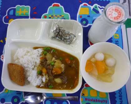 カツカレーライス、フルーツ白玉、ミニフィッシュ、牛乳