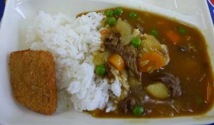 一口トンカツをそえたカレーライスです。今日は1年生の入学をお祝いした献立です。