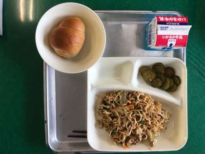 オイスターソース焼きそば、きゅうりの中華あえ、黒糖パン(1/2)、牛乳