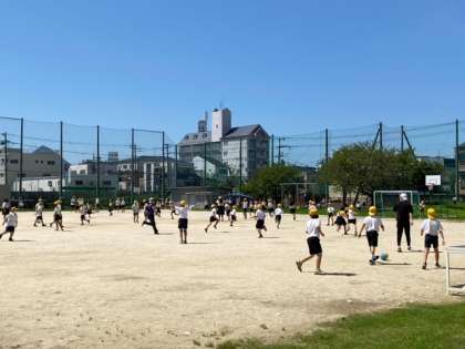 青空が広がっています。運動場では、子どもたちが、おにごっこをしたり、遊具で遊んでいます。