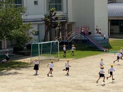 高学年の児童も低学年の児童も、帽子をかぶって暑さ対策をし、ボールや遊具で元気に遊んでいます。