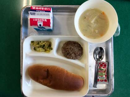 焼きハンバーグ、豆乳スープ、キャベツとピーマンのカレーソテー、ライ麦パン、牛乳