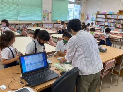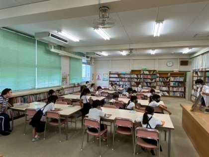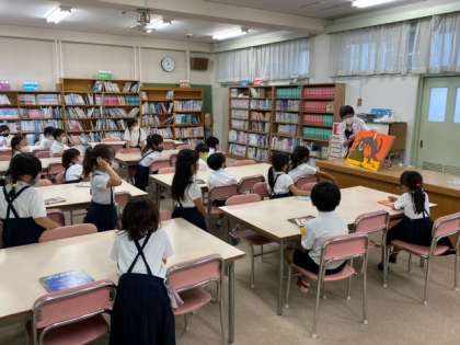 図書館補助員さんによる「絵本の読み聞かせ」です。子どもたちが興味深く聞いています。本の返却と貸し出しもしました。