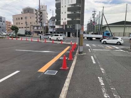 巽南小学校の東側に新しくオープンしたコンビニエンスストア。以前はレストランがあり、空き地になっていました。大きい道路に面していて、車の出入りも多いと予想されます。歩道と駐車場の境にはポールやコーンを置いて事故防止に努めていただいています。