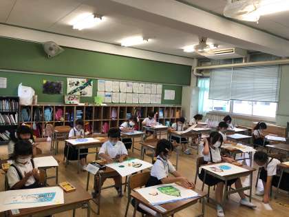 1年1組では、「みてみてあのね」の作品づくりをしていました。テーマは「夏休みの思い出」です。友だちに教えてあげたいことを、パスを使って絵で表現しました。みんな画用紙いっぱいに描いていました。できあがりが楽しみですね!!