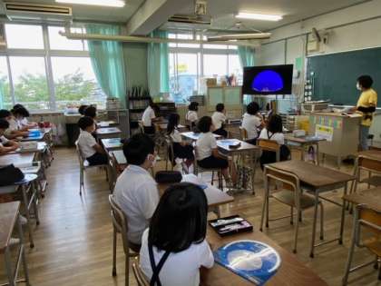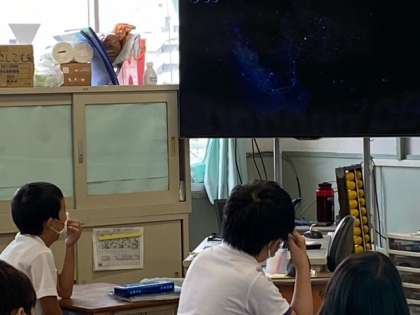 「月や星の動き」の単元です。星の集まりはどのように動くのか、テレビの画面で「さそり座の動き」をじっと見ていました。星座早見盤を使って星座を探したり、星の明るさや色の違いについて考えました。