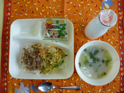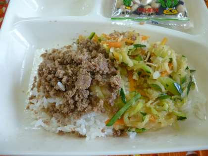 牛挽肉、豚挽肉を甘辛く味つけしたものときゅうり、にんじん、切り干しだいこんを和え物にしたものをご飯にのせて混ぜて食べます。