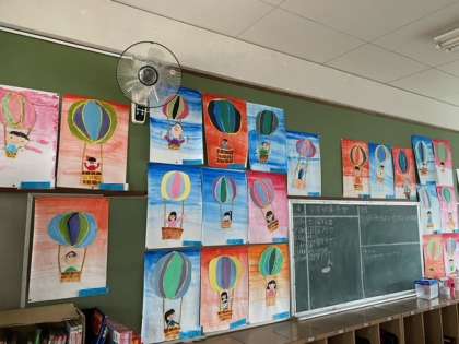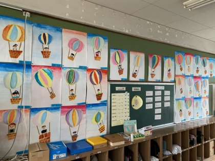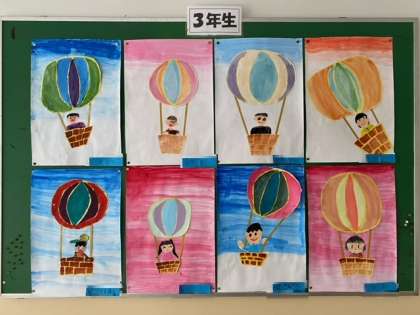 3年生の子どもたちの、図画工作科の「気球に乗って」の絵画作品です。パスと水彩画で描いています。