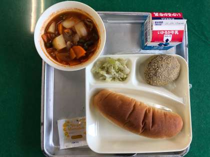チキンレバーカツ、ケチャップ煮、キャベツのバジル風味サラダ、コッペパン、マーマレード、牛乳
