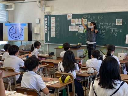 C-NETの先生と一緒です。 「What time do you go to bed ?」 先生の発問に、子どもたちが英語で「寝る時刻」を答えていました。