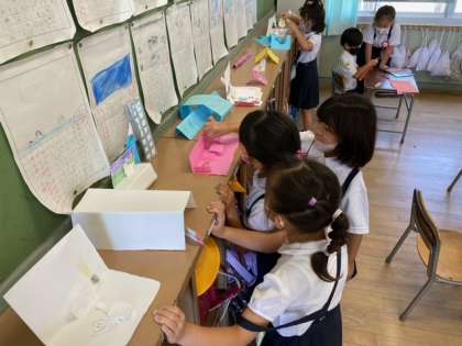1組の図画工作科では、子どもたちができあがった作品を並べていました。
