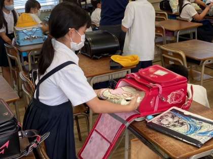(写真は3年生1組です。学習課題や持ち帰る時の注意を担任の先生から聞いて、タブレットをタオルにくるみランドセルに入れています。)