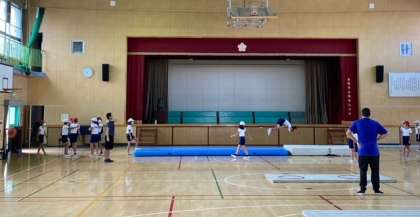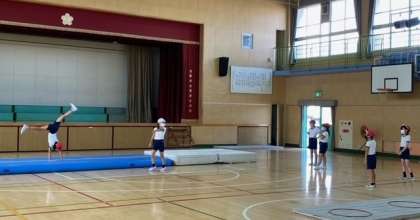 2組の体育科はマット運動です。得意技をバッチリときめていました。
