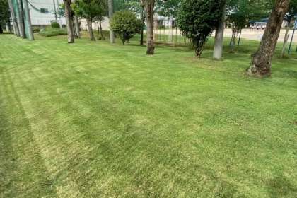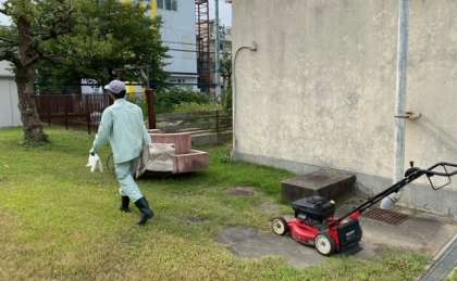 先日来の雨で、伸びていた芝の手入れを管理作業員さんがしていました。