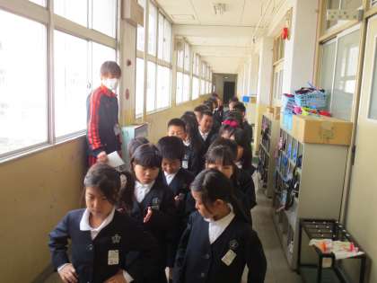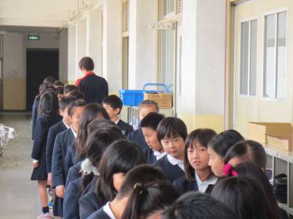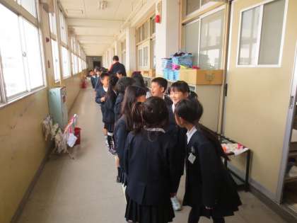 保健室で発育測定をしたあと、教室前で並び順を決めています。