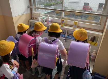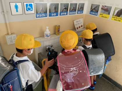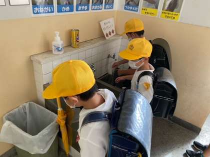 登校してきた子どもたちが、手を洗っています。毎日のよい習慣となっています。