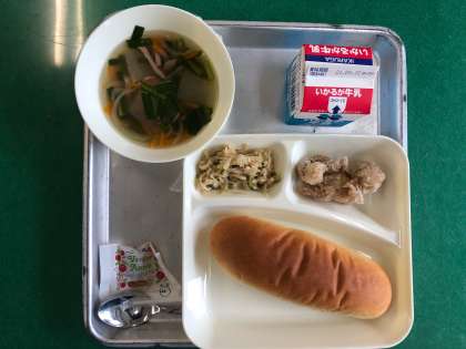 鶏肉のからあげ、とうがんの中華スープ、切干しだいこんのごま辛みづけ、コッペパン、りんごジャム、牛乳