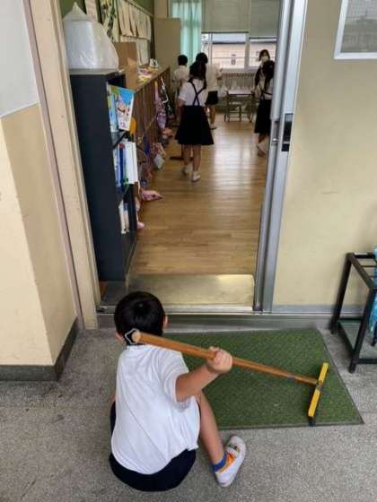 そうじの時間、1年生の子どもたちが、ほうきやちりとり・ぞうきんを手にそうじに集中していました。