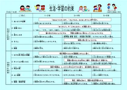 「学びに向き合う子どもたち」を育てるためには、子どもたちが一番安心にて生活できる学校で、毎日継続して学習に取り組むことが大切です。安定した生活・学習リズムは、規則正しい生活習慣と学習に集中できる環境が必要です。「生活・学習の約束」を守ることを通して、子どもたちは自ら、また、互いに落ち着いた場をつくろうとします。そして、自ら学ぶ姿勢を育てていきます。各ご家庭でも様々な「約束」を守らせ、大切に育てられております。学校の「生活・学習の約束」につきましても、ご理解・ご協力のほどよろしくお願いいたします。尚、髪の毛をそめることについては、中学校との連携から約束ごととしております。重ねてご理解ください。