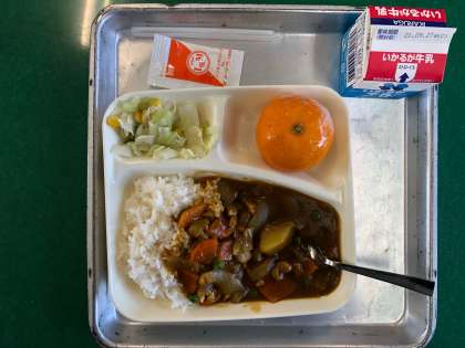 チキンカレーライス(米粉)、キャベツとコーンのサラダ(ノンエッグドレッシング)、みかん(冷凍)、牛乳