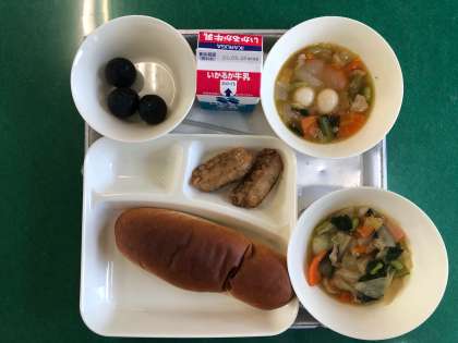 あげぎょうざ、中華煮、ぶどう(巨峰)、黒糖パン、牛乳