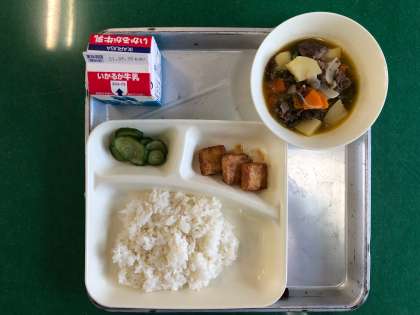 肉じゃが、あつあげのみそだれかけ、あっさりきゅうり、ご飯、牛乳