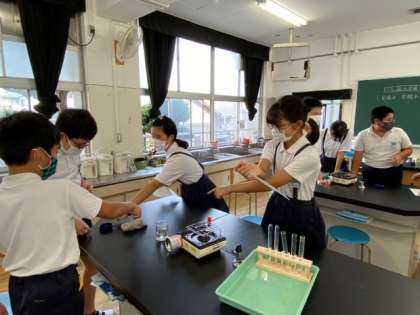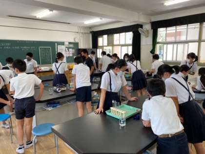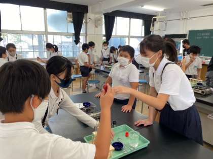 理科室での実験です。水溶液の性質について調べました。「食塩水・炭酸水・うすい塩酸・重そう水・うすいアンモニア水」の5つについて、見た目やにおい・蒸発皿に残ったものを表にまとめました。