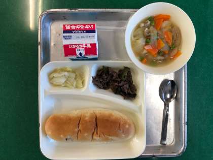 牛肉の香味焼き、スープ煮、サワーキャベツ、おさつパン、牛乳