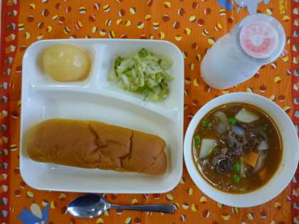 ビーフシチュー、キャベツのピクルス、白桃(缶)、パンプキンパン、牛乳