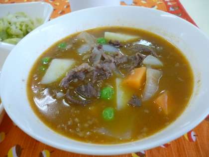 牛肉を主材にしたシチューです。小麦粉とサラダ油でルウを作り、とろみをつけています。