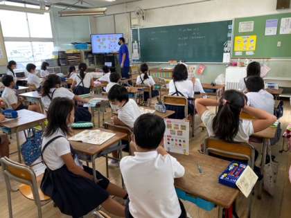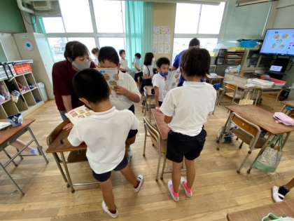 外国語活動です。すきな色を一つ選び、その色の文字について英語でたずねあっていました。