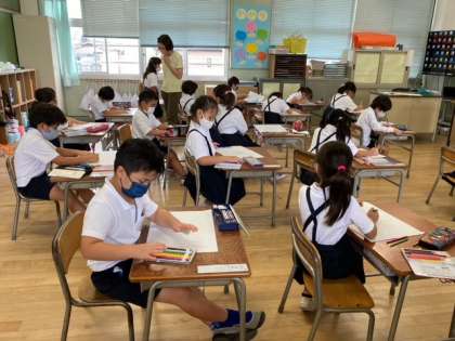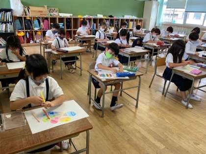図画工作科の「ふしぎな おはな」です。花びらのかたちを考え、パスをぬって、せかいで一つだけの花を描いていきます。