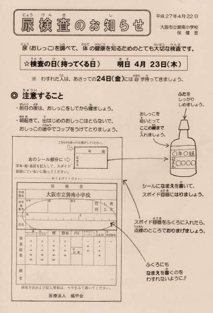 今日、尿を入れる容器と説明文を配付しました。4/23(木)明日の朝に尿をとり、学校に持って来てください。くわしくは「尿検査のお知らせ」をご覧ください。