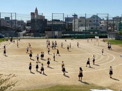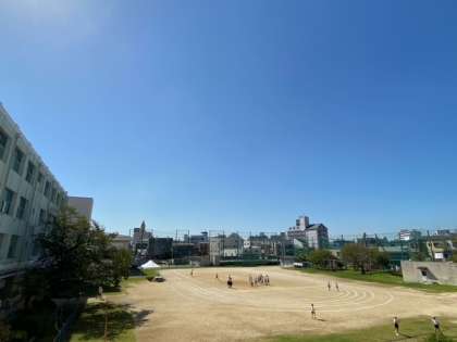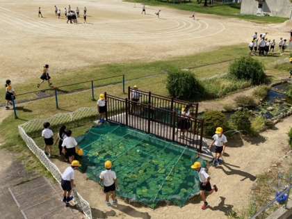 運動場では、子どもたちや一緒に遊ぶ先生の姿がありました。池の生き物を観察している子どももいます。