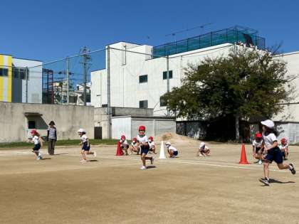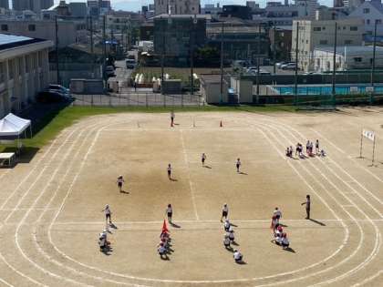 1年生の徒競走です。広い運動場を力いっぱい、最後まで走り切りましょう。