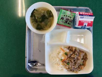 ピリ辛丼、中華スープ、ソフト黒豆、ご飯、牛乳
